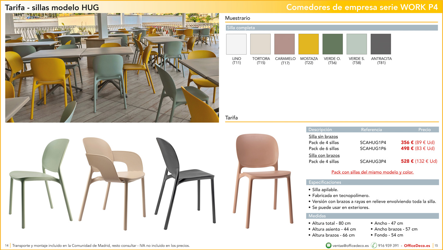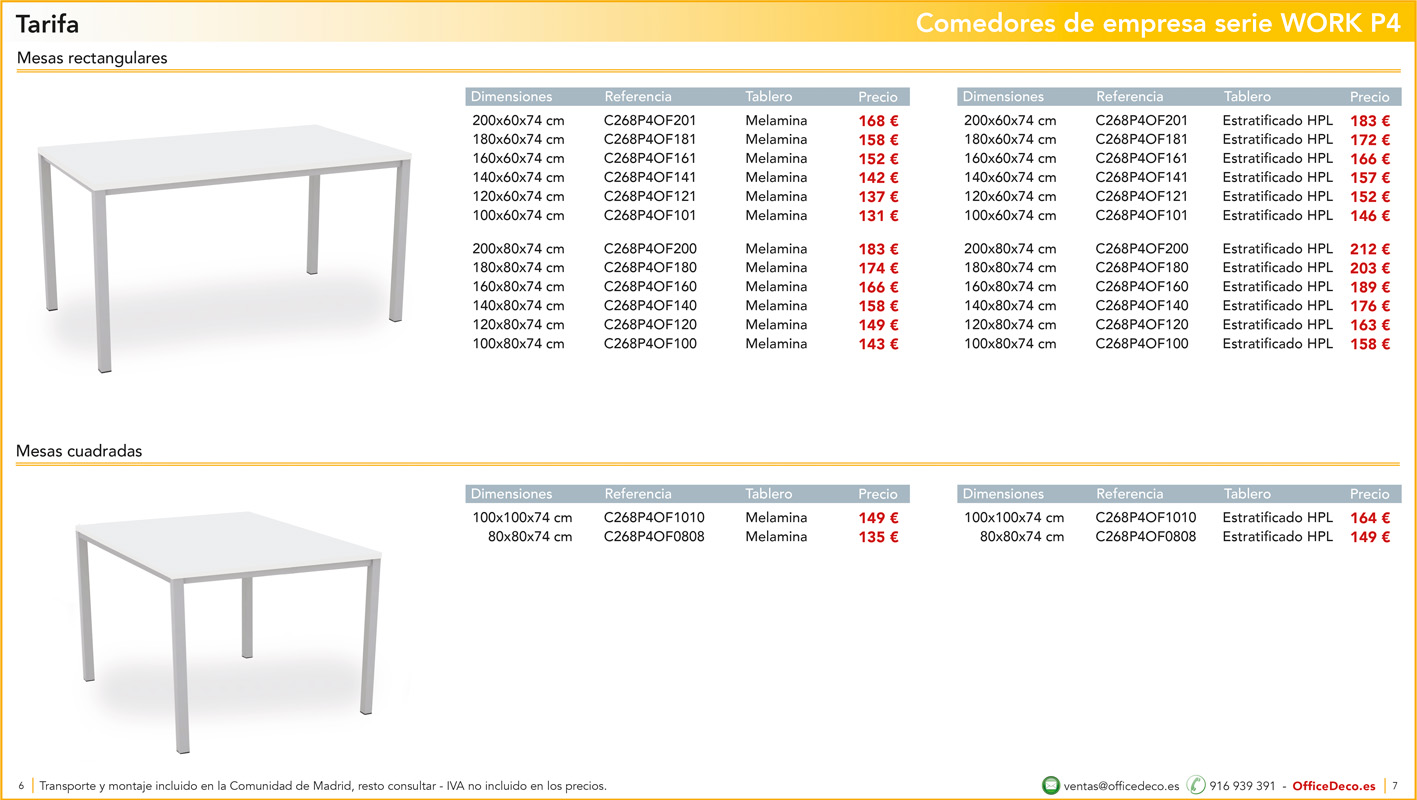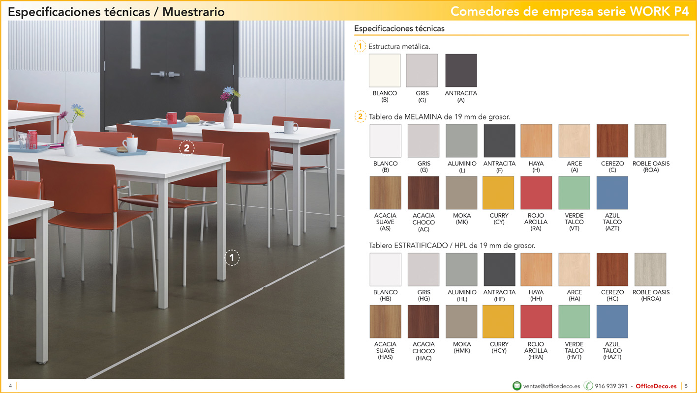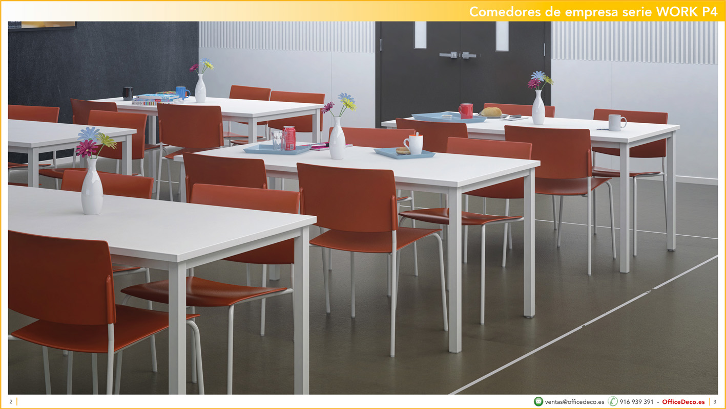 Una amplia colección de líneas de mobiliario para comedores de empresa y escolar serie WORK P4 con infinitas variantes a un precio sin competencia. Montaje y transporte gratuito en la Comunidad de Madrid, resto consultar.