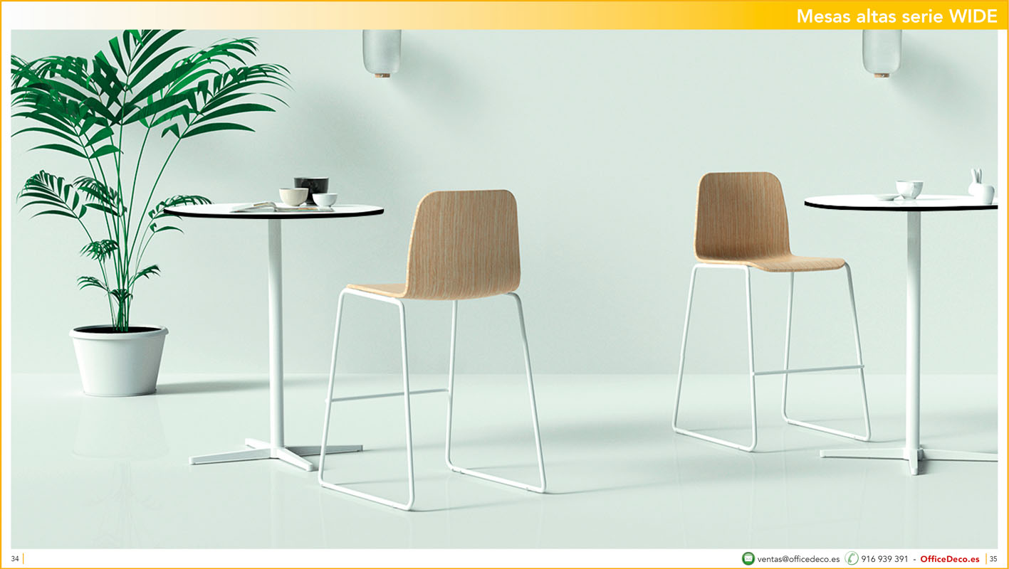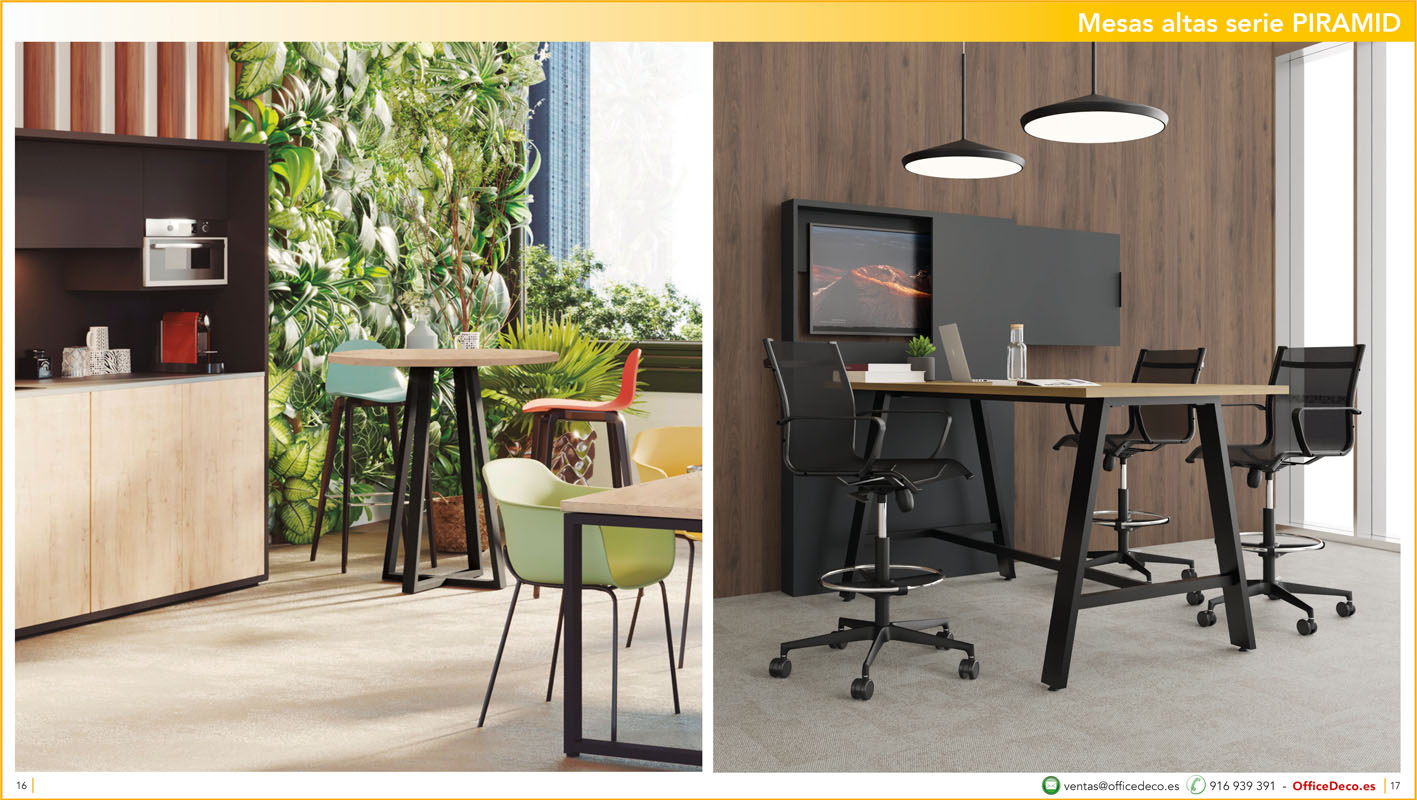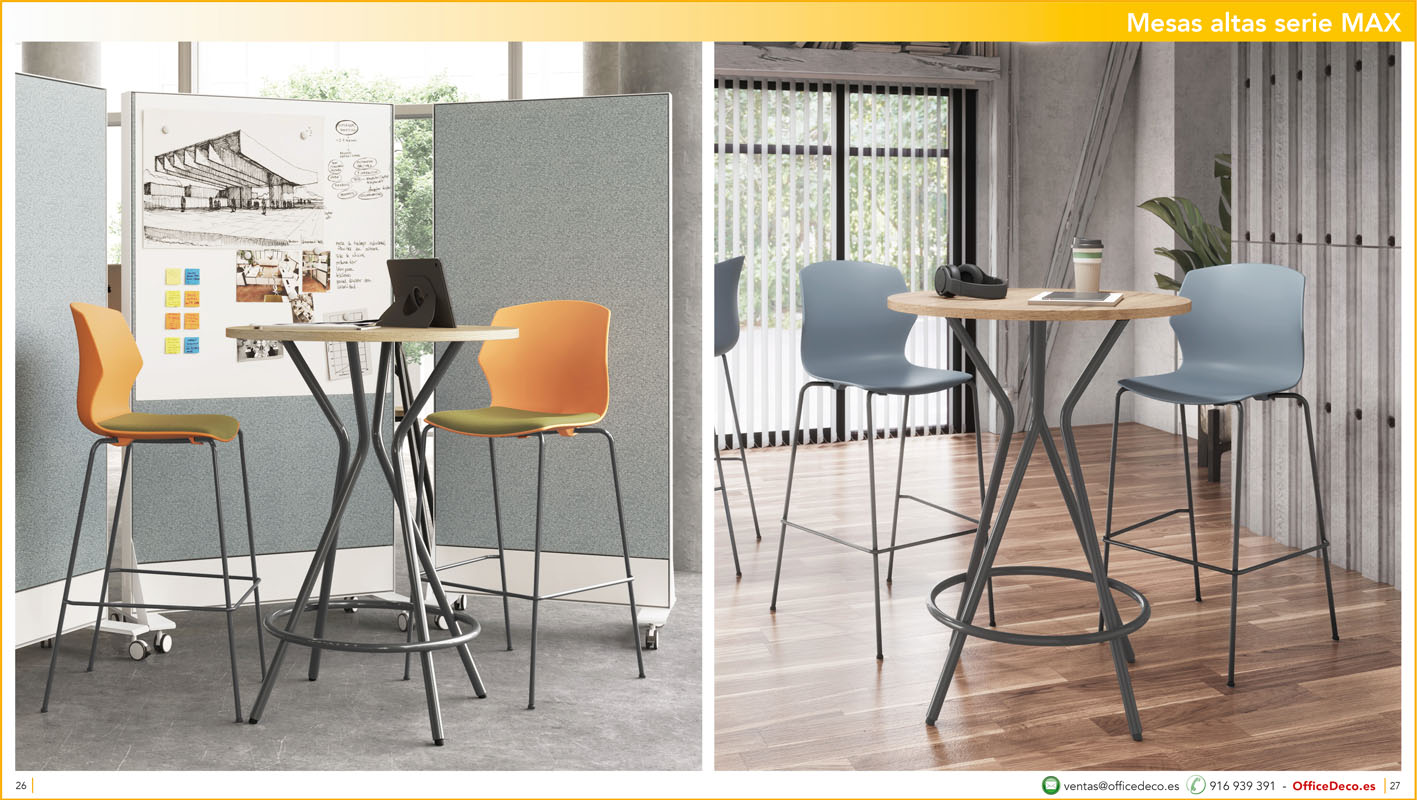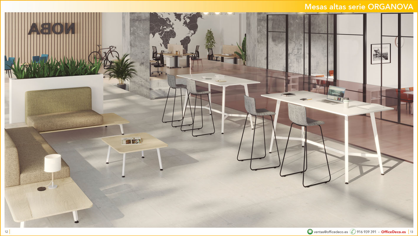 En todas las oficinas es necesario una zona donde poder tomarse un café, relajarse unos minutos, realizar reuniones informales…mesas altas y taburetes para Office.
