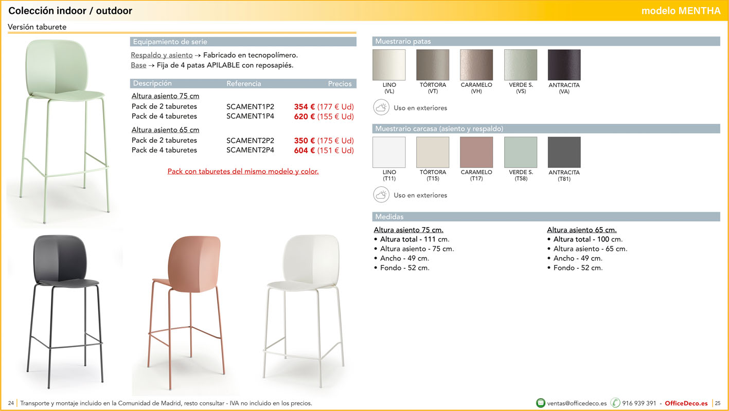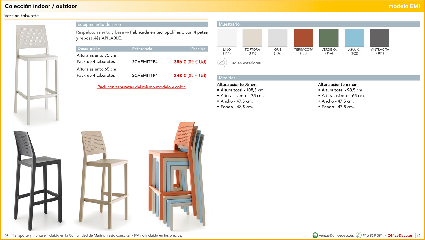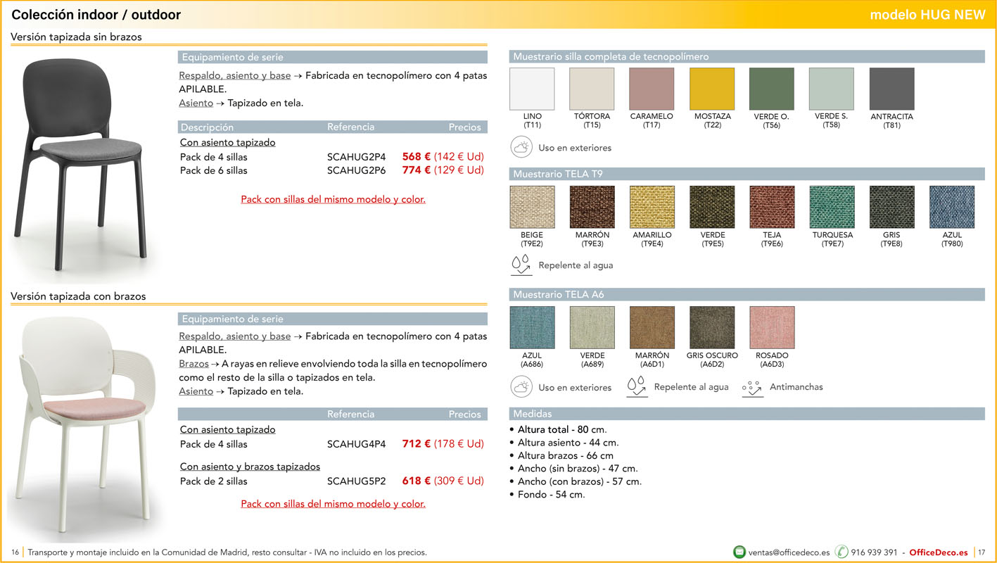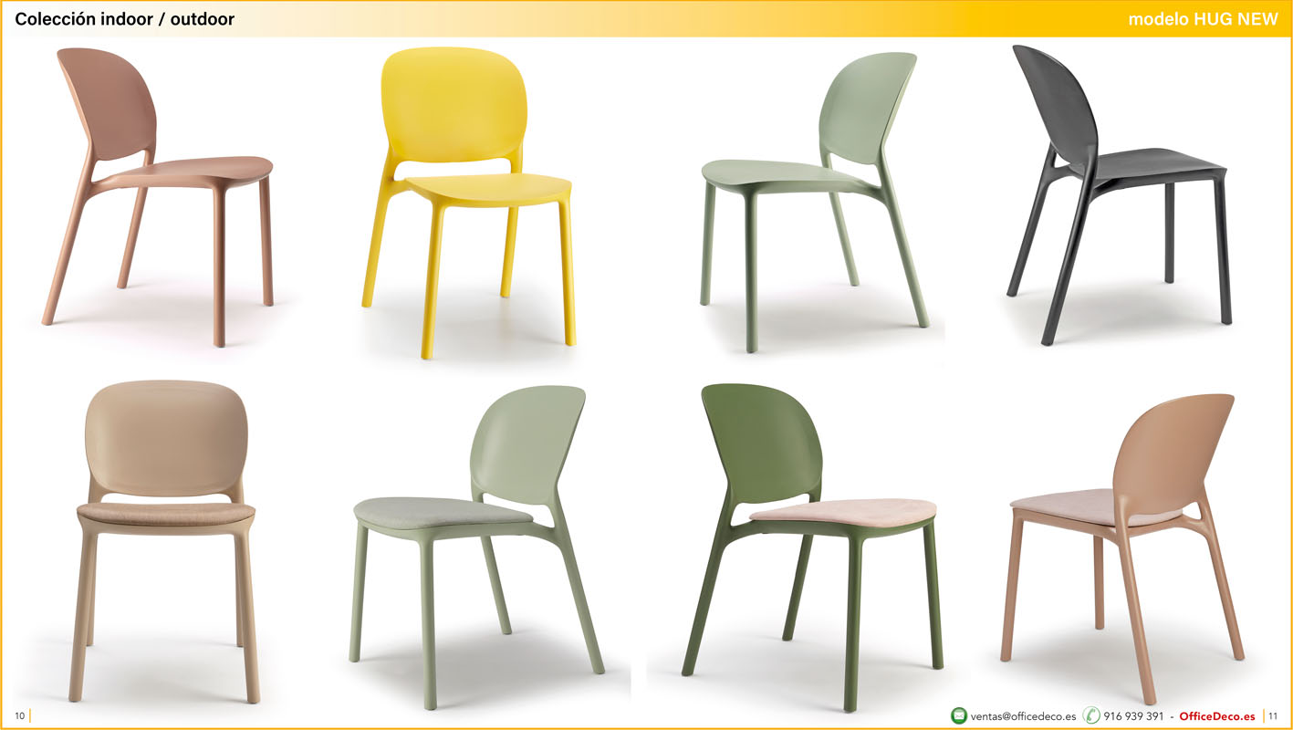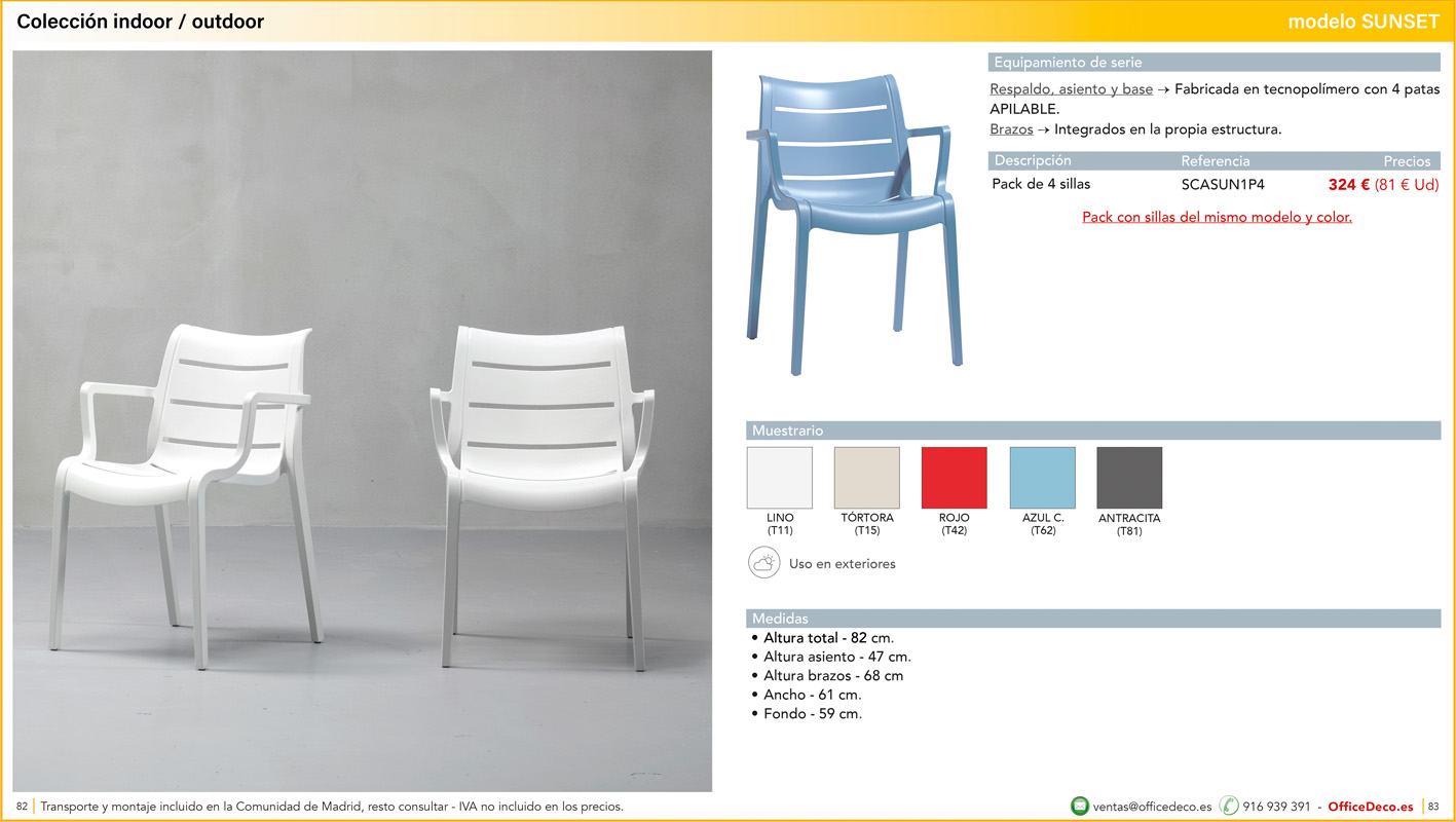 Una amplia colección de sillas Indoor – Outdoor con infinitas variantes a un precio sin competencia. Montaje y transporte gratuito en la Comunidad de Madrid, resto consultar. Para realizar sus pedidos llámenos al Telf.: 916 939 391 o bien envíe un correo a ventas@officedeco.es nuestros comerciales se pondrán en contacto para resolver cualquier duda.